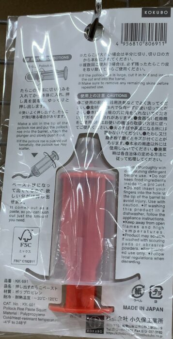 ・たらこの先端に切り込みを入れてから本体に入れ、押し具を装着し、ゆっくりと押し出します。