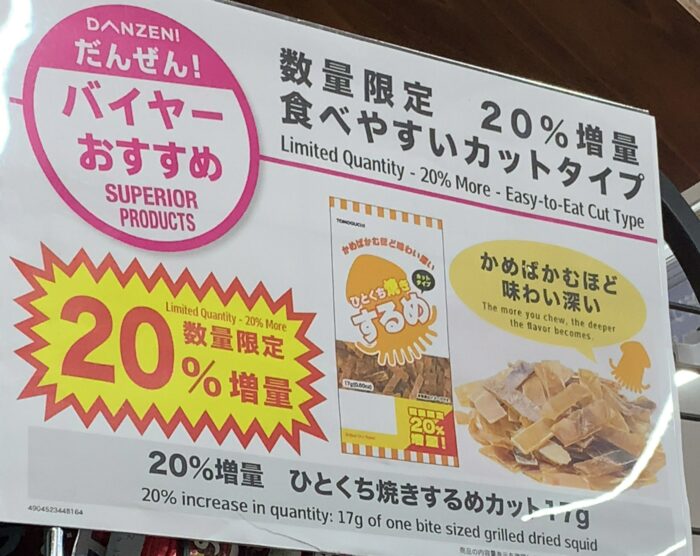 ホーム > ダイソー探険 / 食品 DAISO(ダイソー)探険「友口 ひとくち焼きするめカット」 だんぜん!バイヤーおすすめ 数量限定 20%増量 食べやすいカットタイプ 17g 商品番号 4904523448164 原産国 中国 内容量 17g かめばかむほど味わい深い。 スポンサーリンク 関連投稿 ダイソー探険 / キッチン DAISO(ダイソー)探険「ウィムッシュ ちょい混ぜ マドラー」 ダイソー探険 / マット DAISO(ダイソー)探険「ふんわり吸水バスマット」 ダイソー探険 / 文房具 DAISO(ダイソー)探険「お礼・お祝い袋」 ダイソー探険 / 食器 DAISO(ダイソー)探険「メラミンスプーンフォークセット AS1、黒」 ダイソー探険 / 食器 DAISO(ダイソー)探険「丸皿(縁起物、A)」 ダイソー探険 / 食器 DAISO(ダイソー)探険「ブラックマドラー」 前の投稿 DAISO(ダイソー)探険「ふんわり吸水バスマット」 次の投稿 DAISO(ダイソー)探険「ウィムッシュ ちょい混ぜ マドラー」