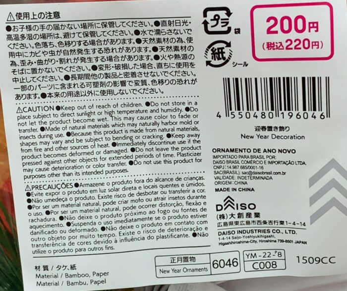 ホーム > 季節の商品 / ダイソー探険 / 飾り DAISO(ダイソー)探険「迎春置き飾り」 低価格でも豪華に飾れます! 鶴(つる) 税込220円 商品番号 4550480196046 原産国 中国 材質 タケ(属:マダケ 種:モウソウチク)、紙 種類 水引、鶴 「迎春」 スポンサーリンク 関連投稿 ダイソー探険 / 時計 DAISO(ダイソー)探険「ディズニー キッズ腕時計」 ダイソー探険 / 文房具 DAISO(ダイソー)探険「クリアギフトタグ」 ダイソー探険 / 食器 / キッチン DAISO(ダイソー)探険「ごちそうおにぎりケース」 ダイソー探険 / 文房具 DAISO(ダイソー)探険「まめきちまめこ ニートの日常 ミニデザインペーパー」 ダイソー探険 / お風呂 DAISO(ダイソー)探険「シャワーボール」 ダイソー探険 / 守る / 生き物関連 DAISO(ダイソー)探険「バルくん 虫こないでネット」 前の投稿 DAISO(ダイソー)探険「ディズニー キッズ腕時計」